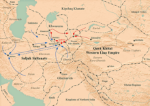 Ahmad Sanjar fought to contain the revolts by the Kara-Khanids in Transoxiana, Ghurids in Afghanistan and Qarluks in modern Kyrghyzstan, as well as the nomadic invasion of the Kara-Khitais in the east. The advancing Kara-Khitais first defeated the Eastern Kara-Khanids, then followed up by crushing the Western Kara-Khanids, who were vassals of the Seljuks at Khujand. The Kara-Khanids turned to their overlord the Seljuks for assistance, to which Sanjar responded by personally leading an army against the Kara-Khitai. However, Sanjar’s army was decisively defeated by the host of Yelu Dashi at the Battle of Qatwan on September 9, 1141. While Sanjar managed to escape with his life, many of his close kin including his wife were taken captive in the battle’s aftermath. As a result of Sanjar’s failure to deal with the encroaching threat from the east, the Seljuk Empire lost all its eastern provinces up to the river Syr Darya, and vassalage of the Western Kara-Khanids was usurped by the Kara-Khitai, otherwise known as the Western Liao in Chinese historiography.[51]